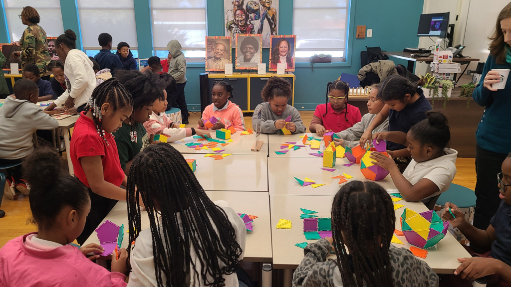 Just in time for the 100th anniversary of Black History Month, the Center of Black Student Excellence at the Long Beach Unified School District inaugurated its new space for playful math. This space is established by the Mathhappens Foundation, and I was honored to be at its opening celebration along with Chris Nho of Mathhappens. It was an exhilarating day, with 200 students from 6 different schools spending time with us in the Math Room over the course of the day. I had the time of my life with these curious and creative students. You can see the Geometiles table in the main image above.