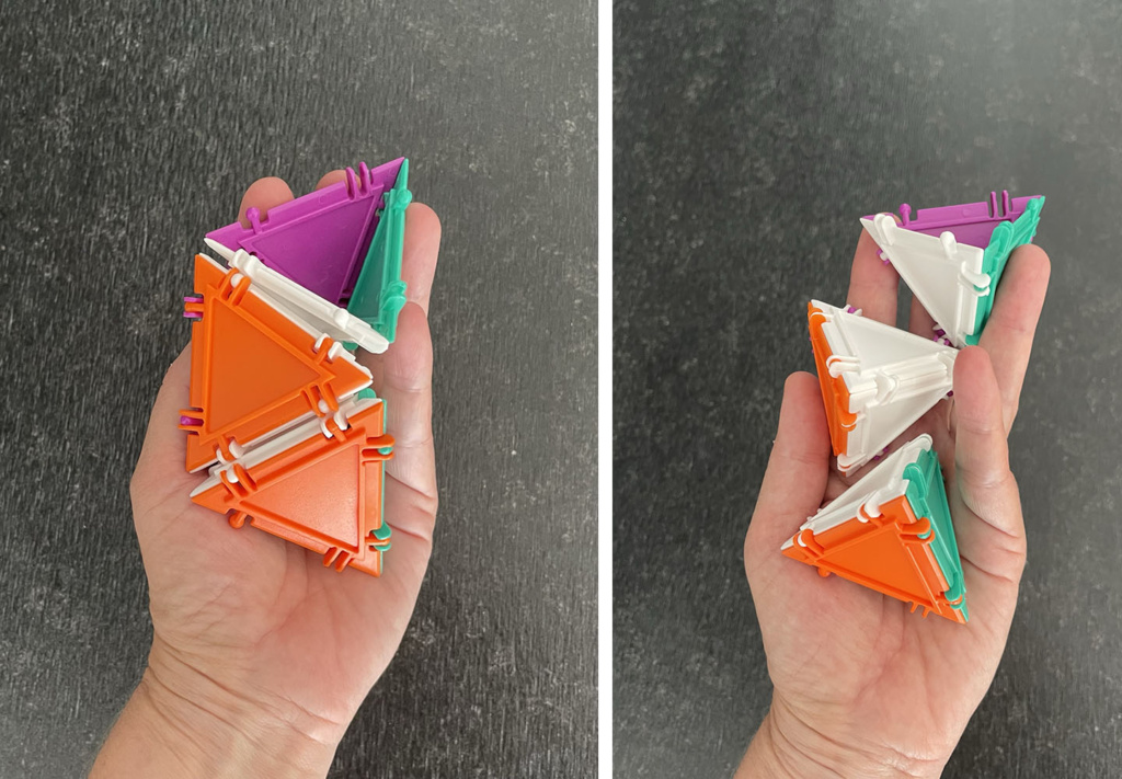 The helix part of the name is quite apparent, but the tetra is less so. It turns out that the helix in the main image above can be thought of as a bunch of regular tetrahedra glued together. The first 3 “links” in the chain of the tetrahelix are shown below.
